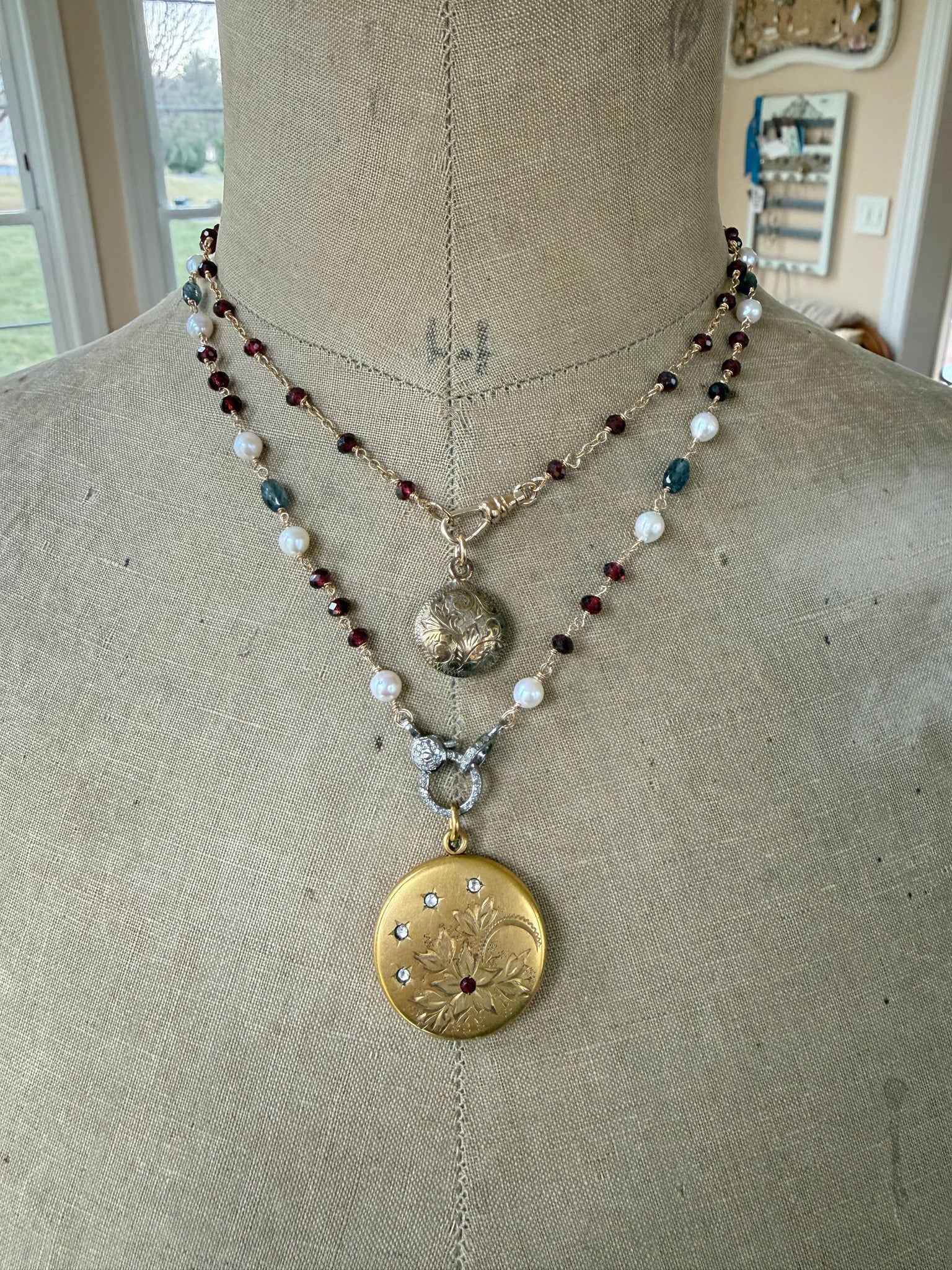 A charming antique watch fob with in gold filled metal is given new life as a pretty pendant. The fob is puffy, and has beautiful chasing on both sides. Suspended from and antique style swivel clasp, the fob makes a perfect, small pendant. The chain is completely hand fabricated using small lengths of cable chain and wire wrapped garnets. It closes with a lobster claw clasp.