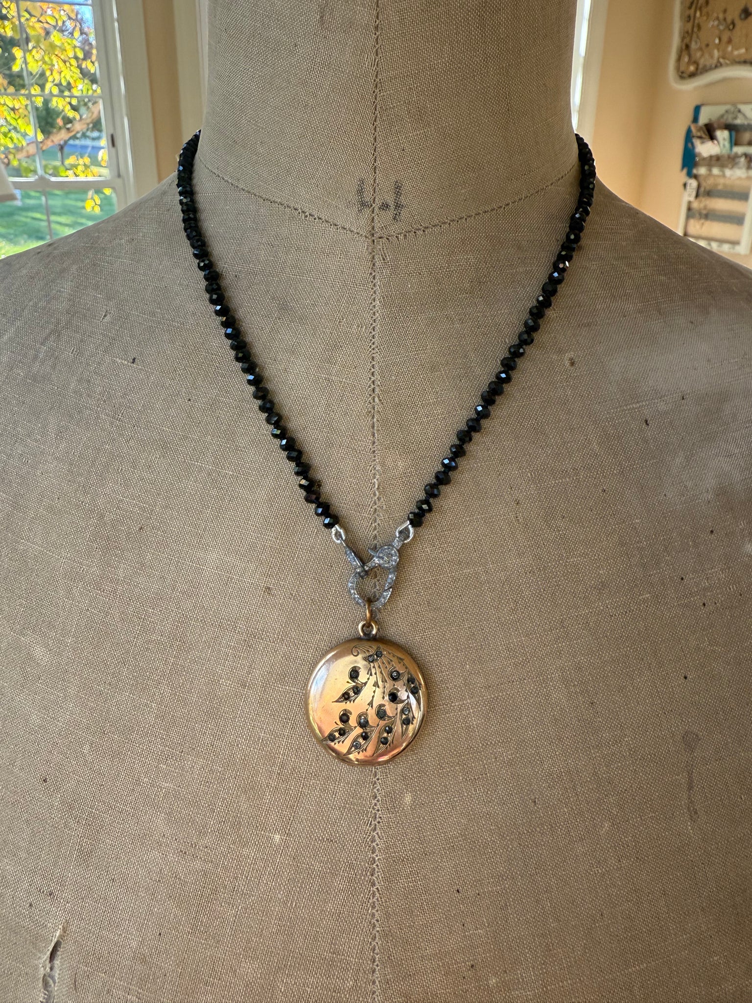 Suspended from a hand knotted silk necklace of 4mm black spinel rondelles and a pavé diamond clasp in sterling silver. The locket is removable from the necklace and the necklace can be worn with other pieces in your collection.