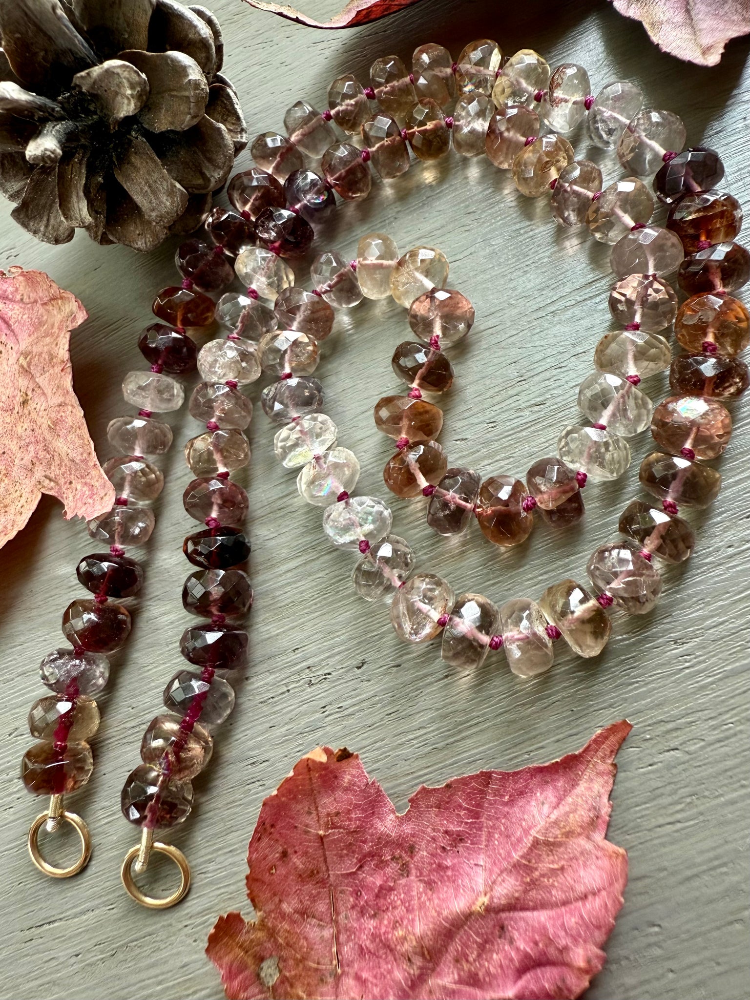 This gorgeous necklace features the gemstone fluorite. The faceted stones have vitreous luster with a transparent quality showing a shaded group coloring of light to dark cognac brown hues. In fact, some have a reddish/purple tone. The beads show a 'whiskey in water' effect creating a blurred refraction of light within these gorgeous gemstones.  Each stone was individually strung and hand knotted on berry colored thread, and the necklace closes with two 14k gold jump rings for you to attach your favorite carabiner or connector, or one of mine. Please note that the carabiner and connector shown are NOT included, but can be purchased separately.