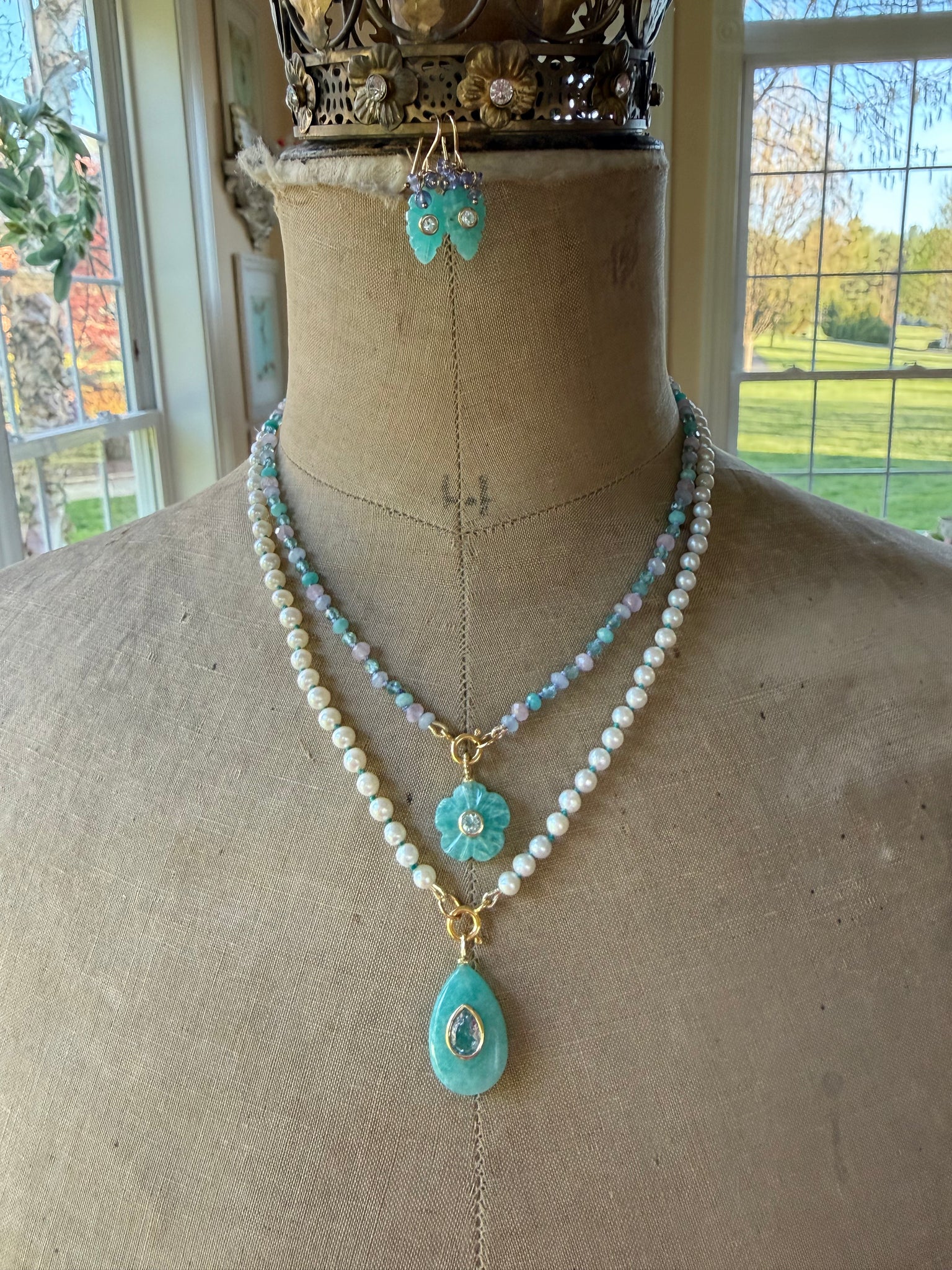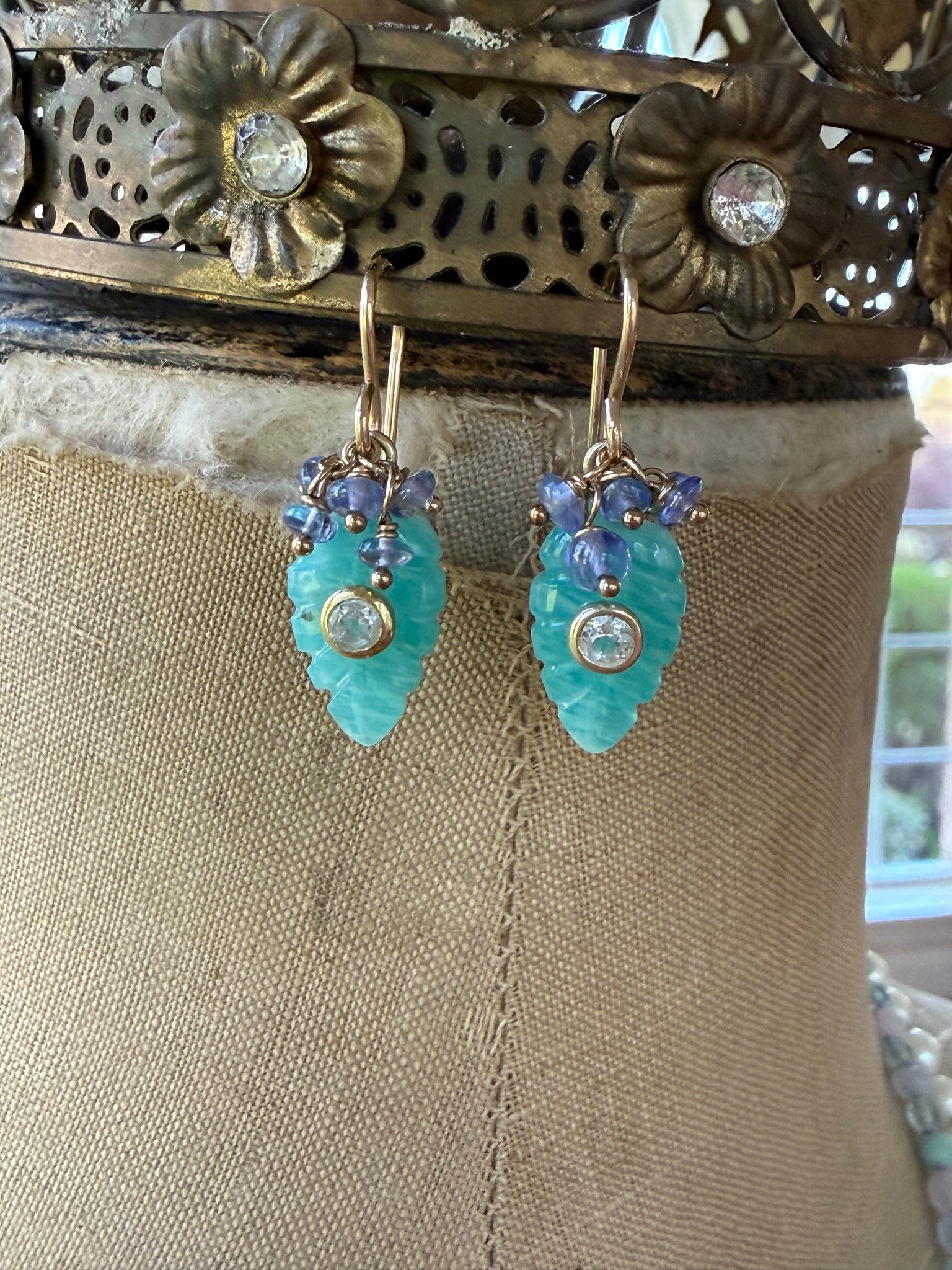 This delicate earrings feature carved amazonite leaves with a white topaz set in the center.