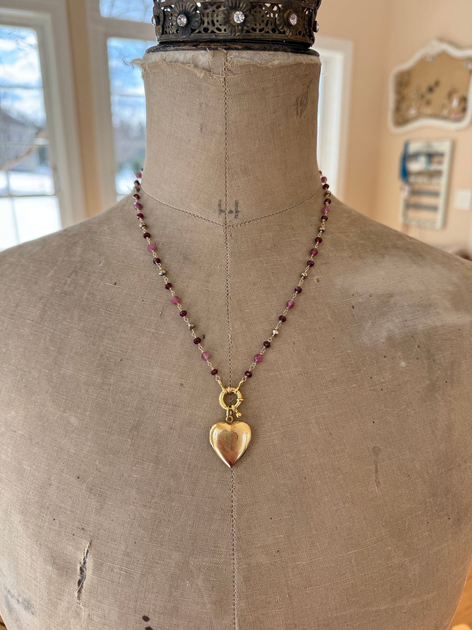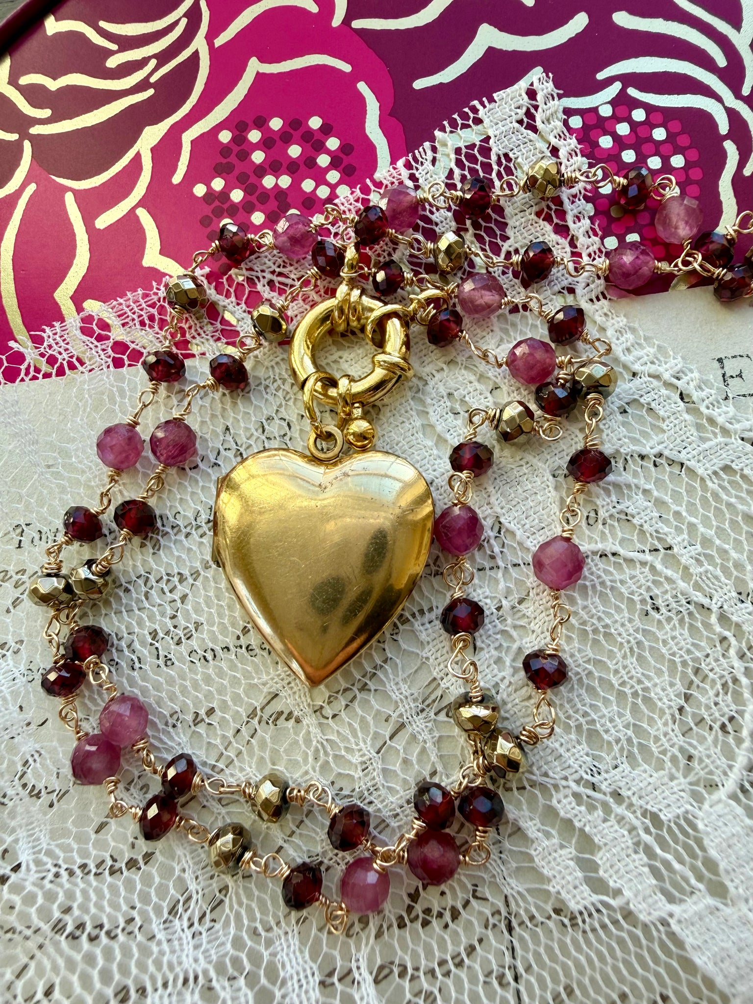 This vintage, gold filled locket is a classic. Suspended from a hand wired chain of sparkling pyrite, garnet, and pink tourmaline, it is detachable from the charm clasp.