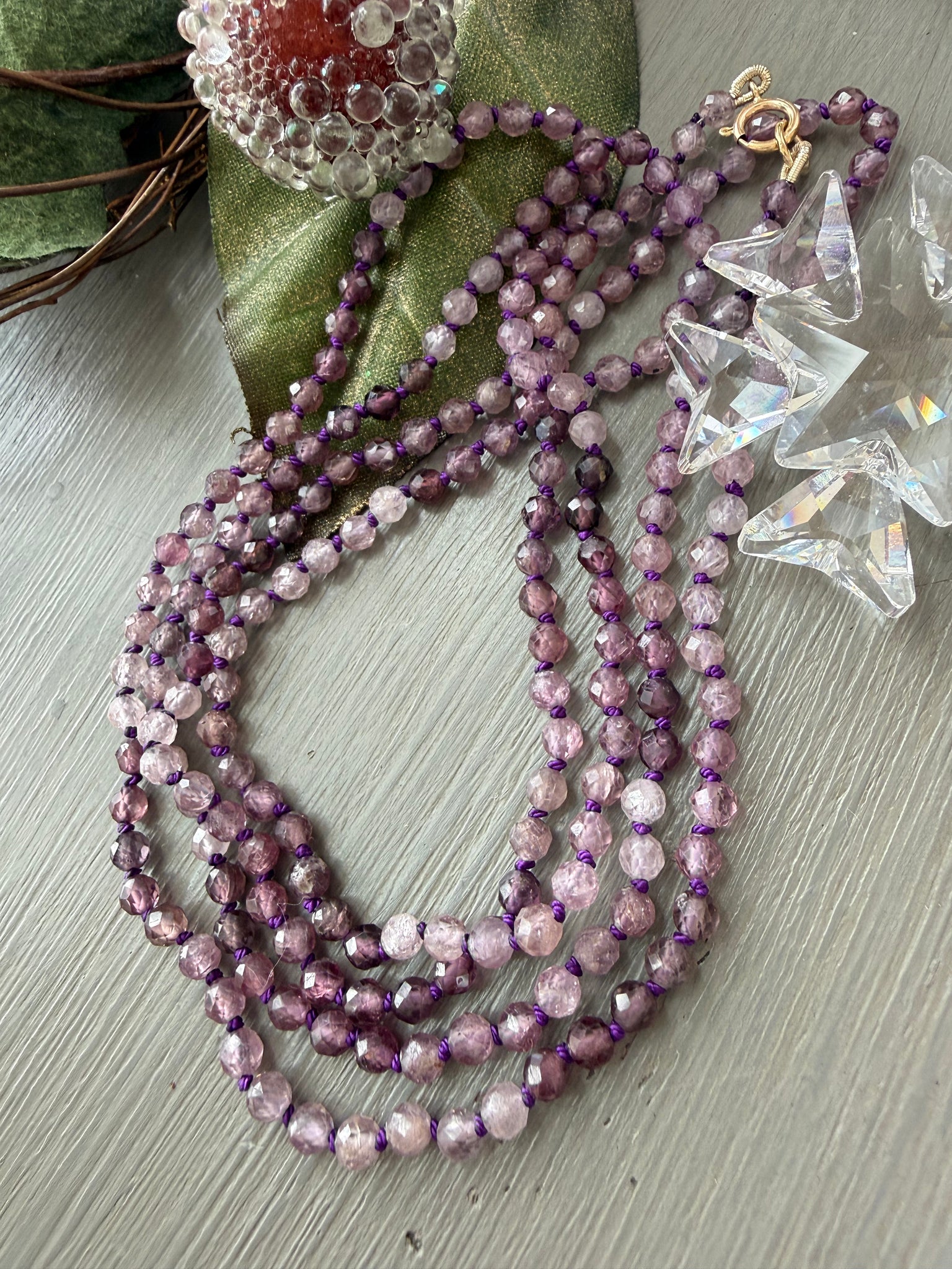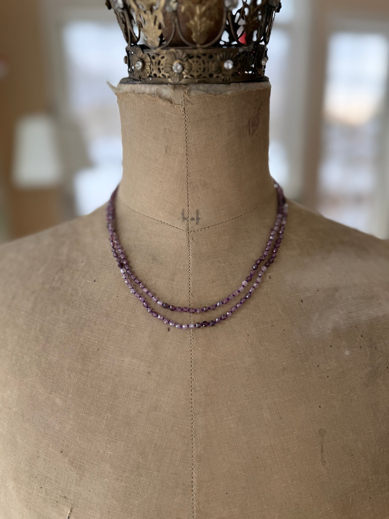 Perfect Plum! Varying shades of petite sized (3mm) plum spinel range from light to dark to create this labor of love. Measuring 34” long, each stone was individually strung and then hand knotted silk. This beauty can be styled multiple ways- scroll through the photos. Wear it doubled or with other necklaces from my shop or your own jewelry box. It can be slipped over one's head and worn with a favorite tunic, tee, or sweater.