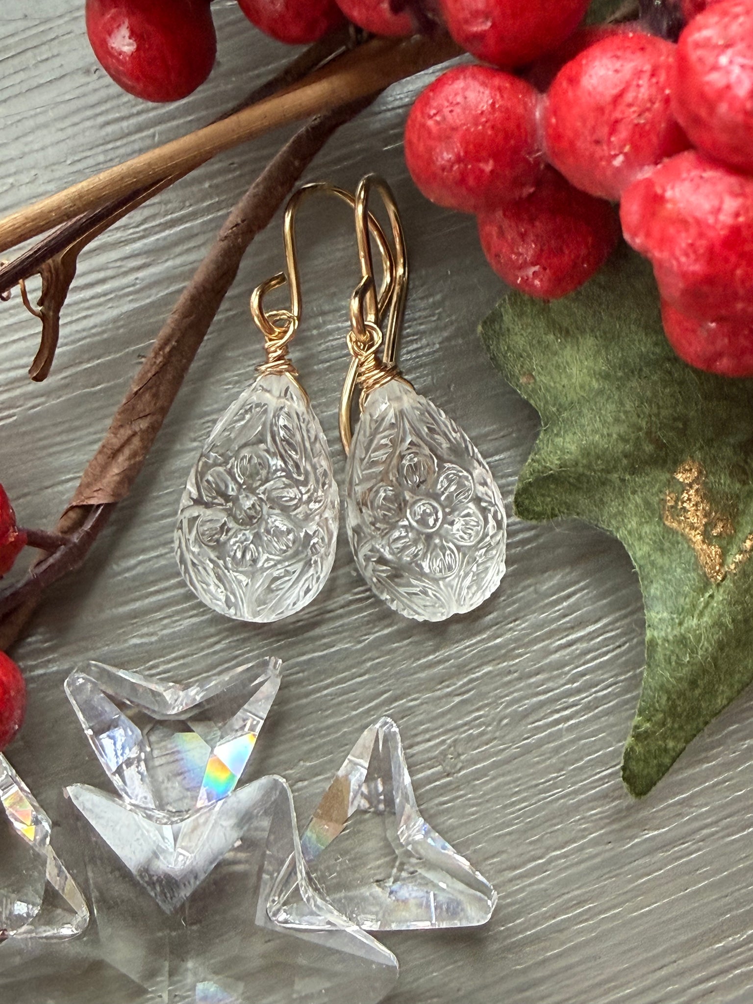 Carved rock crystal quartz briolette earrings. Wrapped in gold filled wire and earring hooks, the beauty of these natural stones needed no further embellishments. Classic beauties for everyday.